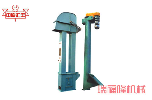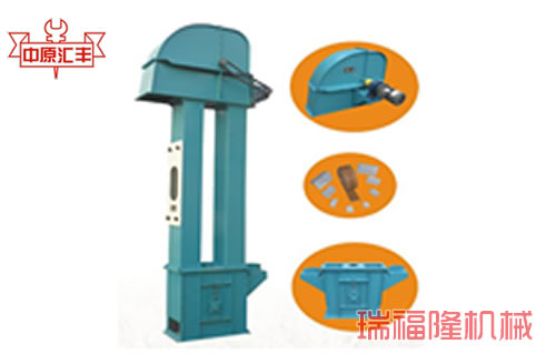 传动机构(可根据用户要求制作)通电后,带动头轮使畚斗带由下而上循环运动,通过固定在畚斗带上的畚斗,将进入机座进料口的物料装满传送到提升机头部,由于头部外壳按抛物线形设计,使物料在离心力的作用下从出料口抛出,空的畚斗又经过畚斗带传动回到提升机机座,装满物料后又被提升上来抛出,这样反复循环,把底部物料提升到指定高度下料,达到垂直输送的要求。
